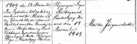 På Sydsiden tæt op til og omtrent ud for Midten af en Tjørnehæk, der danner Skellet mellem Gaardejerne Knud Brøndum og Poul Tøttrups Ejendomme paa Bjerregrav Mark, Bjerregrav Sogn, Sønderlyng Herred. | Bjerregrav Sogns Kirkegaard, Sønderlyng Herred den 19. November 1909 | Maren Jørgensdatter |